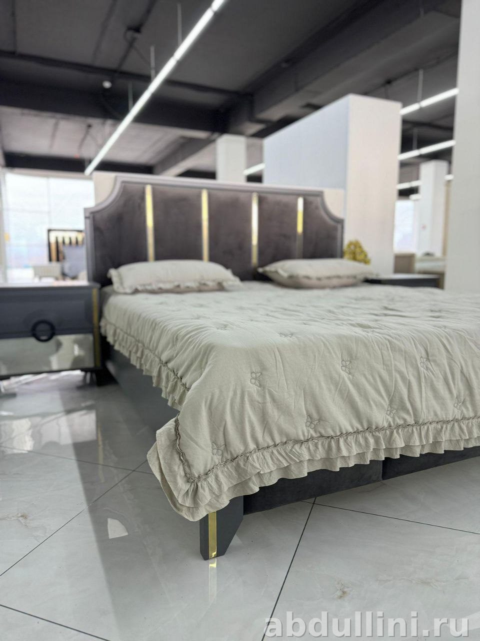 Кровать выполнена с вертикальными золотистыми вставками на изголовье и оборкой с рюшами по периметру. Тумбочки оснащены выдвижными ящиками и дополнены тонкими золотистыми полосками. Каркас изготовлен из ЛДСП или МДФ с матовым покрытием, а изголовье обито мягкой тканью серого цвета.