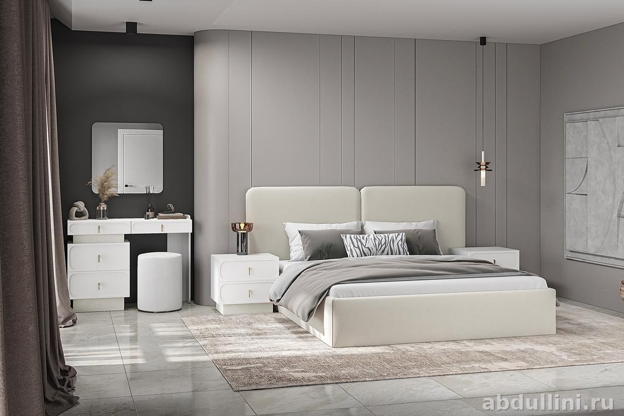 Новинка от фабрики «Регион Мебель» (Ставрополь). Комплект в белом цвете для современной спальни. Корпус из ЛДСП 16 мм, фасады — крашеный МДФ в эмали. Петли с доводчиками, направляющие полного выдвижения.
