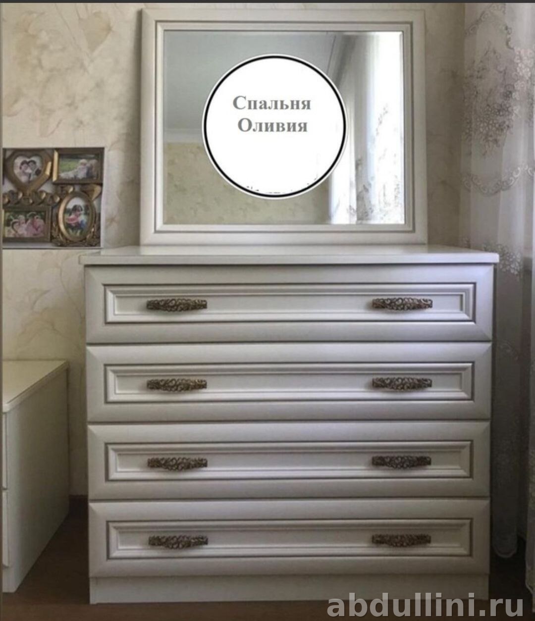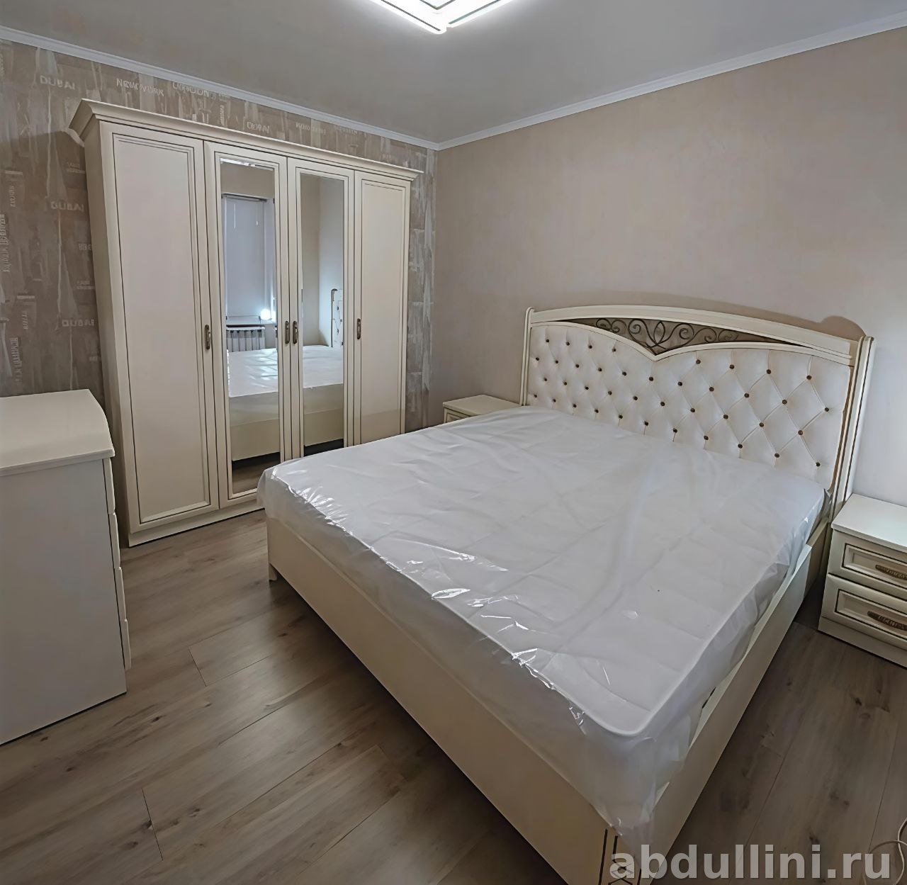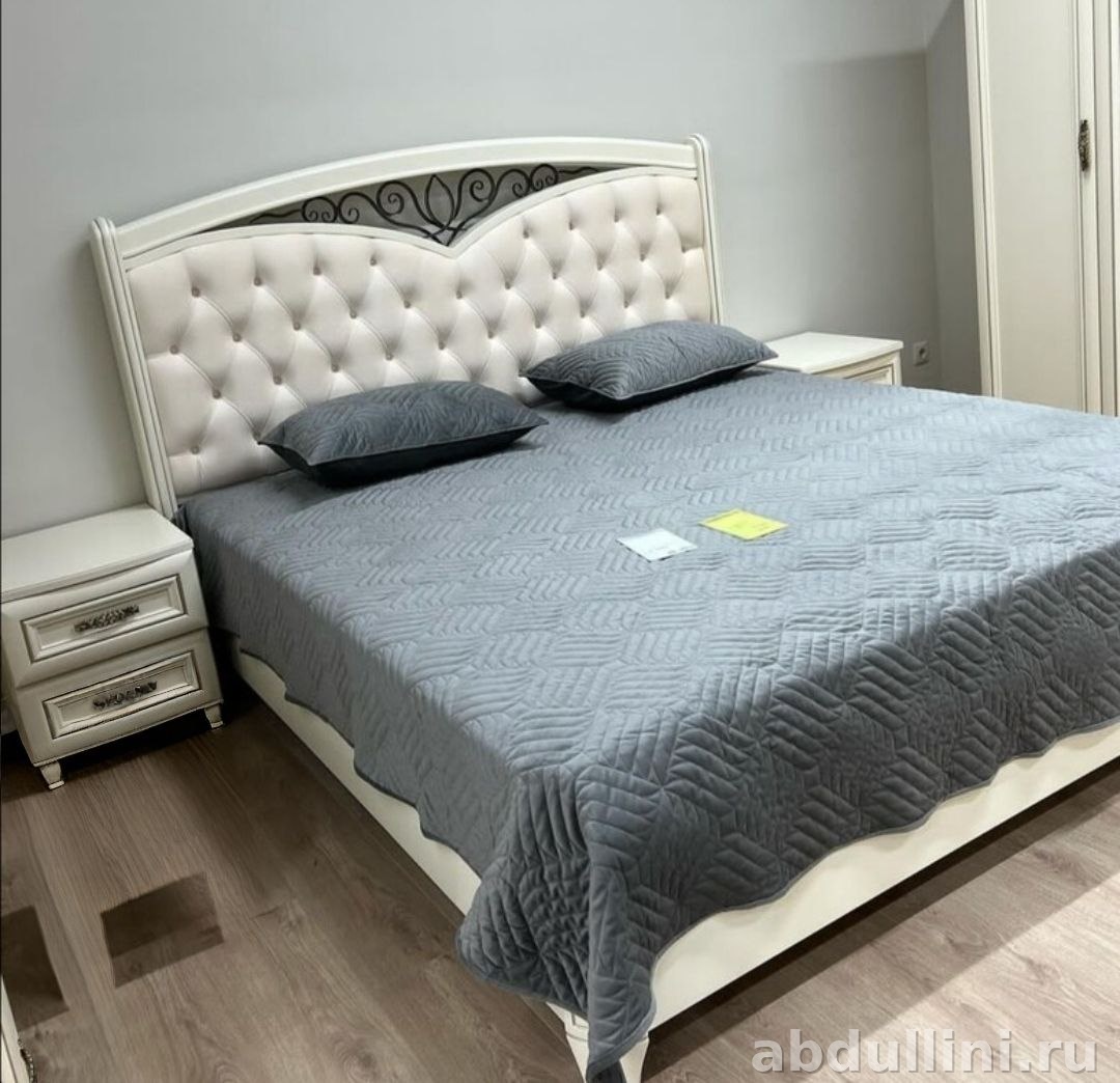 Комплект мебели для спальни, выполненный в стиле неоклассики. Основной цвет — теплый жемчужный оттенок, который гармонично сочетается с золотистыми акцентами. Поверхность матовая, что добавляет мебели изысканности.
