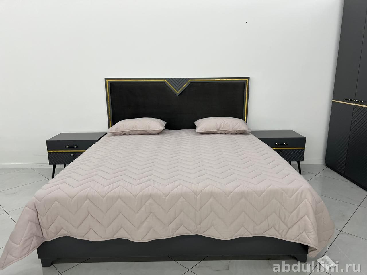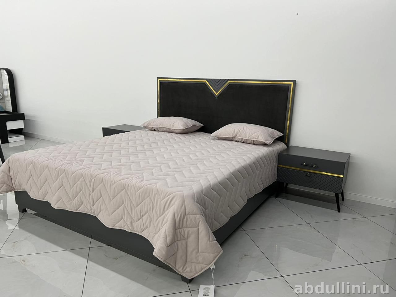 Комплект мебели для спальни в стиле ар-деко с современными акцентами. Основной цвет — графит с матовой текстурой, декоративные элементы выполнены в золотом цвете, что создает эффектный контраст. В комплект входит кровать с мягким изголовьем и две прикроватные тумбочки.