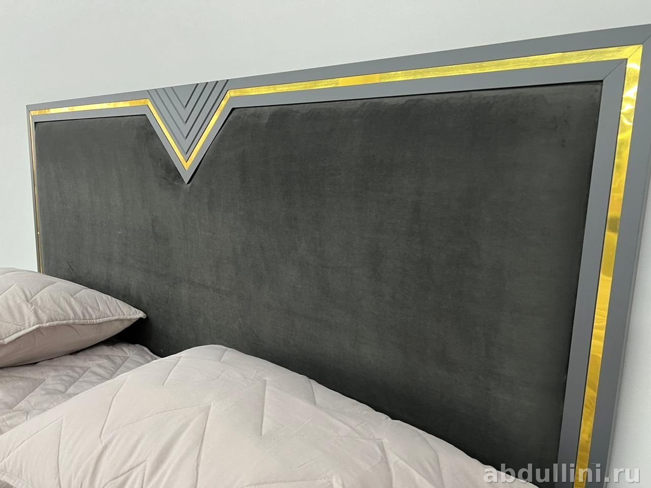 - Кровать: прямоугольная форма, мягкое изголовье, обитое тканью темно-серого цвета. Золотая окантовка добавляет стильности.