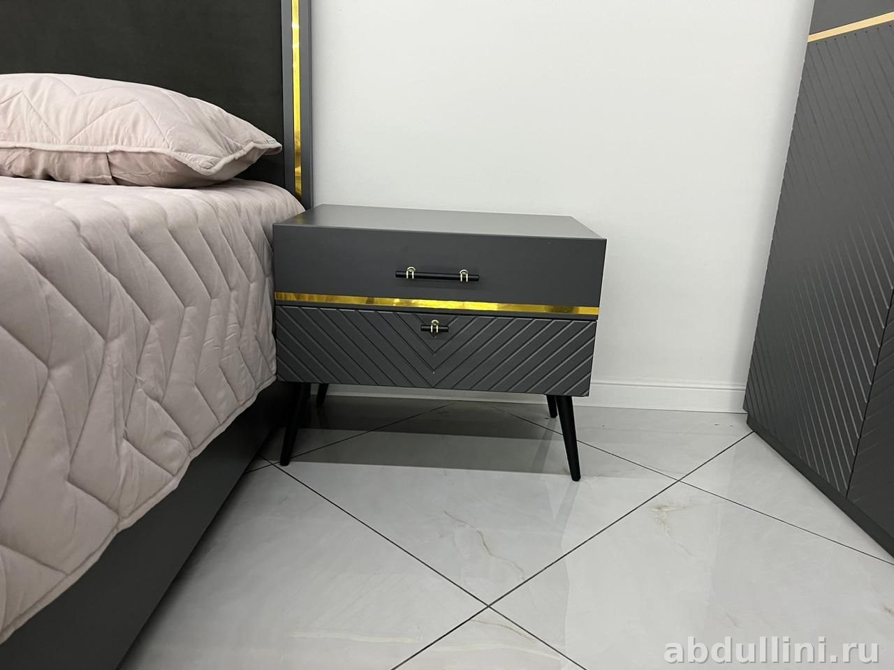 - Тумбочки: по два выдвижных ящика с металлическими ручками, золотая отделка гармонирует с изголовьем кровати.