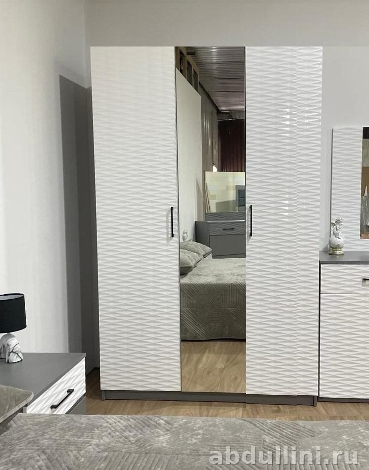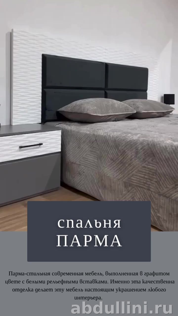 Комплект мебели для спальни Парма 3150 — это стильное и функциональное решение для вашего дома. В комплект входит кровать, две прикроватные тумбочки и шкаф с зеркалом. Все элементы выполнены в едином дизайне, сочетающем белый и графитовый цвета.