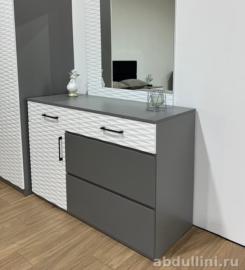 Шкаф оснащен распашными дверями, одна из которых с зеркалом. Двери шкафа — белые, глянцевые, с рельефным узором. Весь комплект выполнен в современном стиле, подойдет для любых интерьеров.