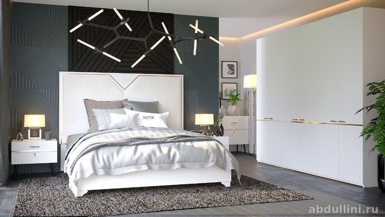 Готовый комплект для спальни в современном стиле с элементами неоклассики. В набор входит кровать с высоким тканевым изголовьем, две прикроватные тумбы, 6-дверный шкаф и комод. Основной цвет — белый, с золотистыми акцентами и геометрическим узором на фасадах.
