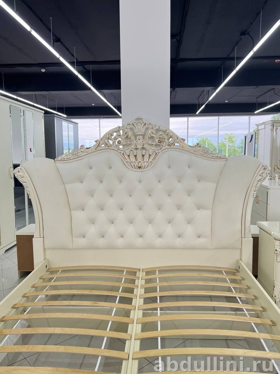 Материалы: корпус из МДФ или ЛДСП с глянцевым покрытием, декоративные элементы из полиуретана с позолотой, обивка изголовья — экокожа или текстиль. Мебель произведена в Ставрополе компанией Fortuna Home.
