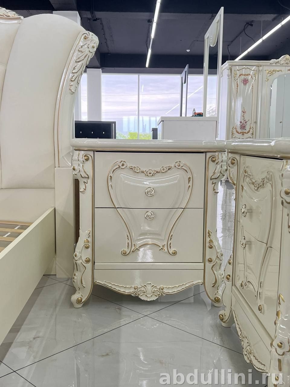 Мебельный комплект для спальни в классическом стиле с элементами барокко. Основной цвет — кремовый с глянцевой отделкой, которая добавляет блеск и легкость. Декоративные элементы выполнены в позолоте, что подчеркивает изысканность дизайна. В комплект входят: кровать, шкаф с зеркальными дверцами, туалетный стол, тумба и пуф.