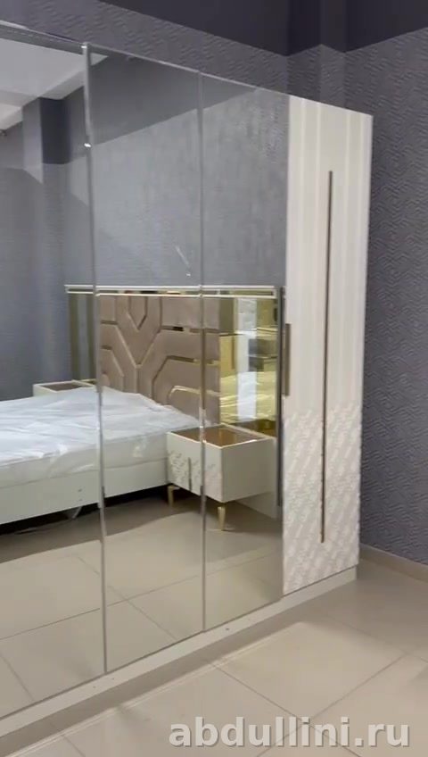 - Конструкция: кровать с высоким изголовьем, декорированным мягкой обивкой и зеркальными вставками; прикроватные тумбочки с выдвижными ящиками и открытыми полками; туалетный столик с выдвижными ящиками, открытыми полками и прямоугольным зеркалом в золотистой раме; шкаф-купе с раздвижными дверями и зеркальными вставками.