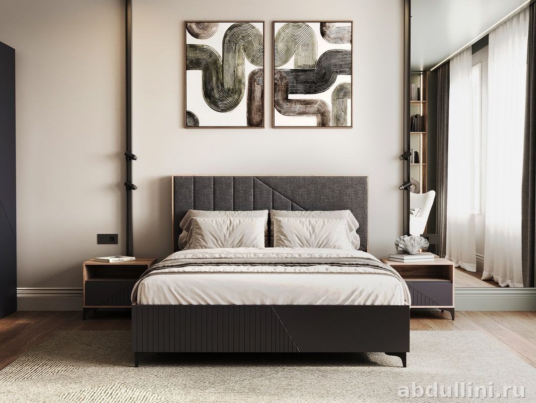 Комплект мебели для спальни в современном стиле с элементами ар-деко. Включает кровать и две прикроватные тумбочки. Производство — Россия.