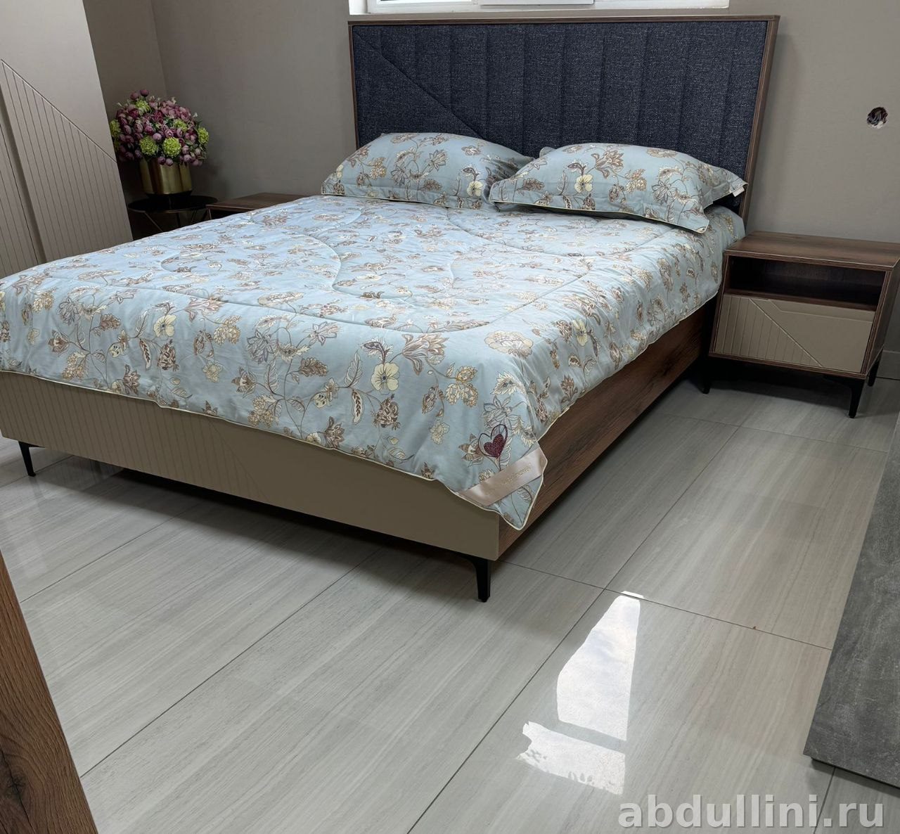 - Изголовье кровати — серая ткань под лен