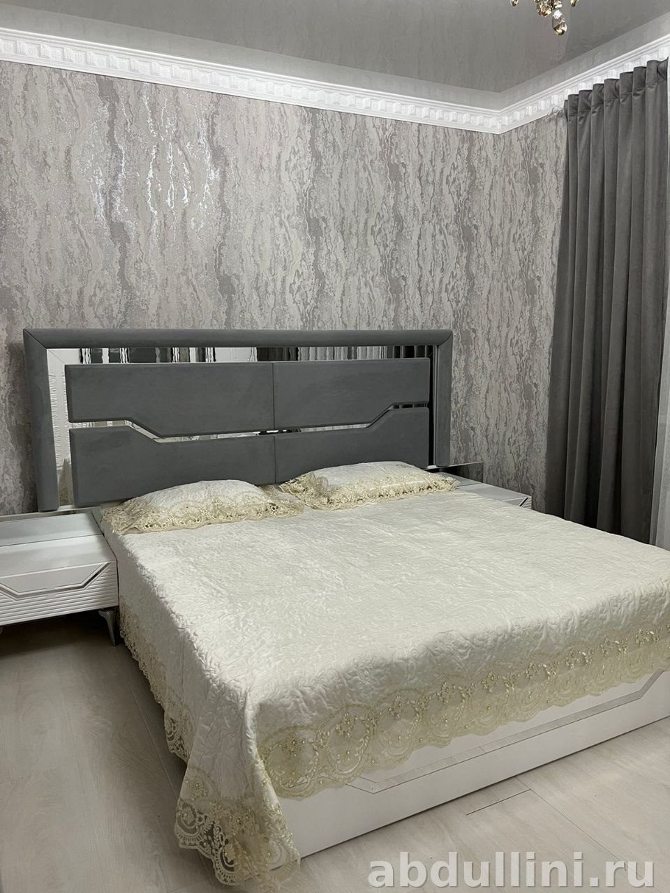 - Кровать: изголовье серое с матовой отделкой, основание белое.