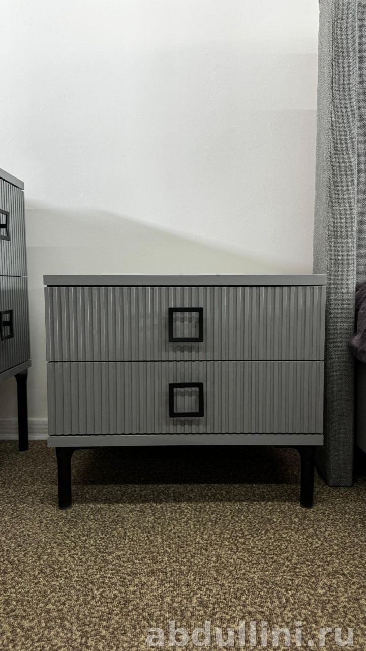Все элементы мебели выполнены в приглушенном сером цвете с матовой отделкой, что придает им модный и простой вид. Каркас мебели изготовлен из МДФ или ЛДСП, что обеспечивает долговечность и устойчивость конструкции. Изголовье кровати обито тканью с вертикальной прострочкой, добавляющей визуальную текстуру и элегантность.
