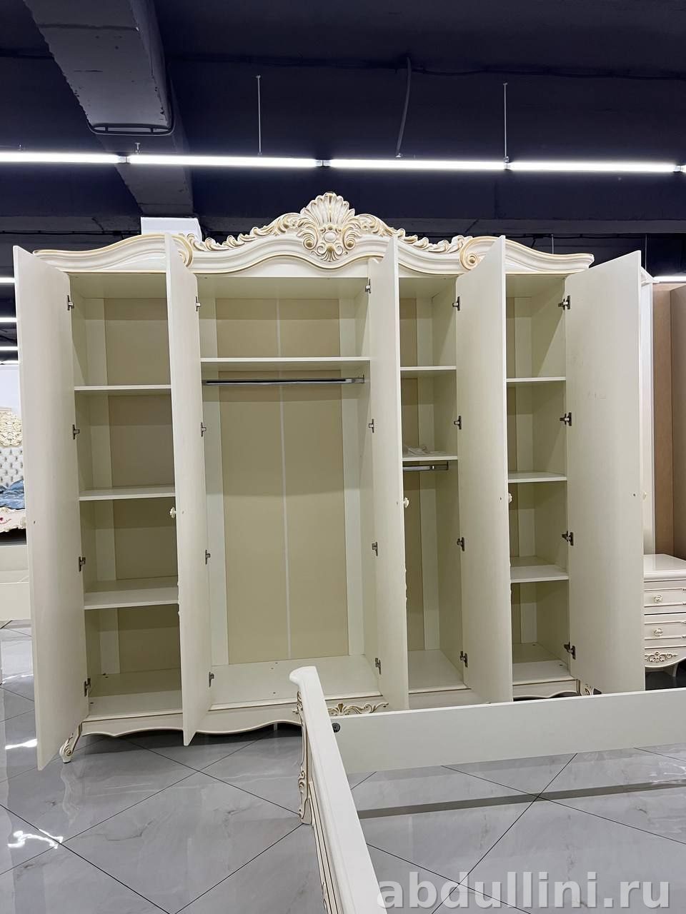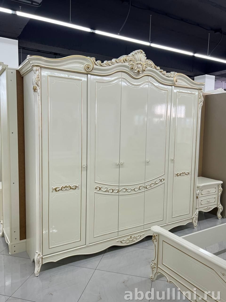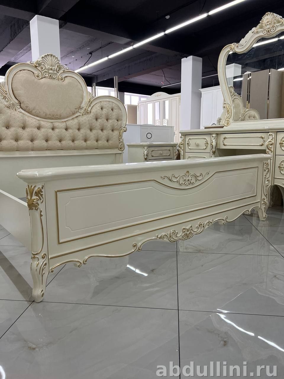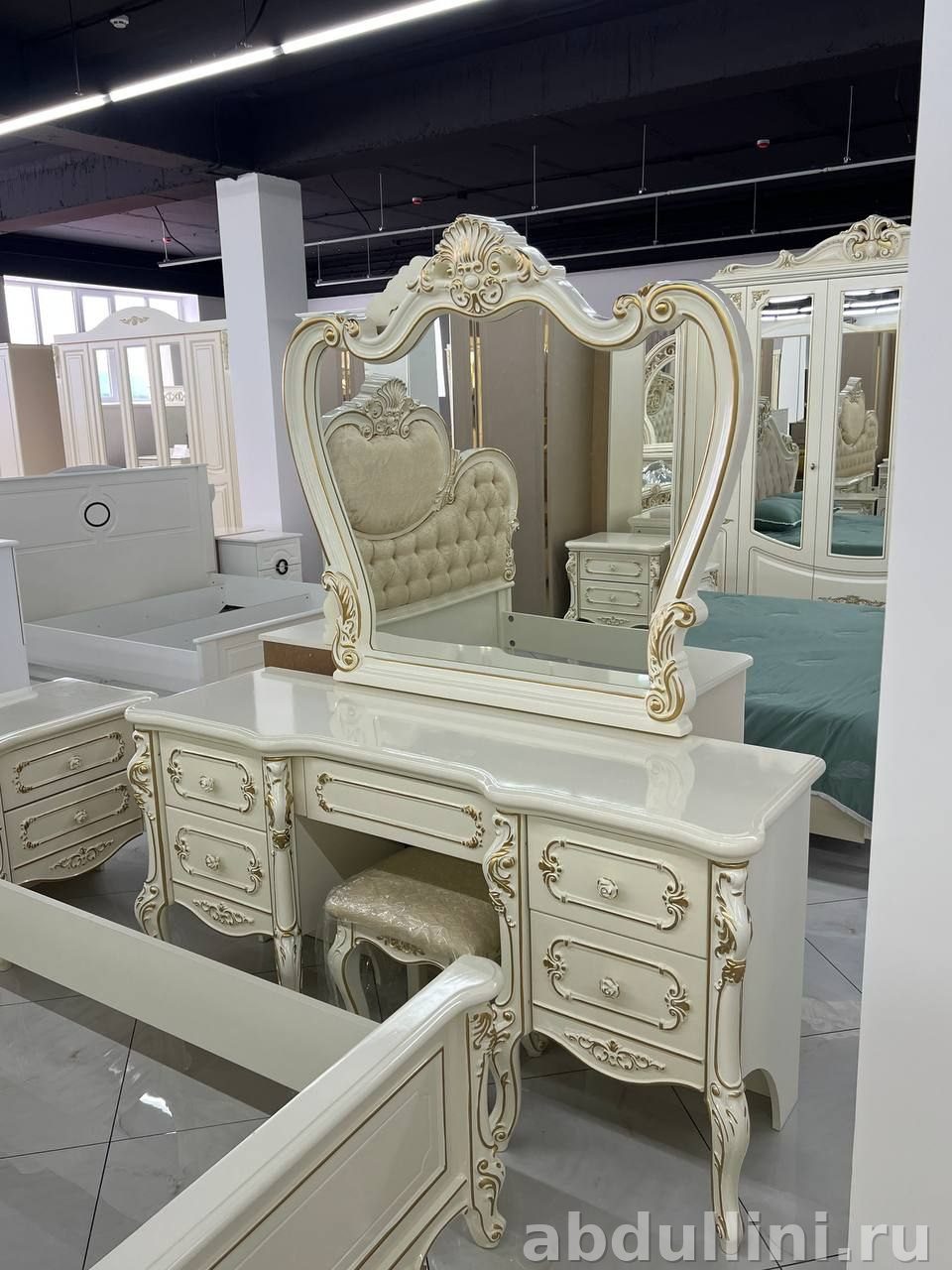 Мебельный комплект в классическом стиле с элементами неоклассики. Основной цвет — слоновая кость или кремовый с золотистой отделкой. Глянцевая или полуглянцевая поверхность подчеркивает изысканность дизайна.