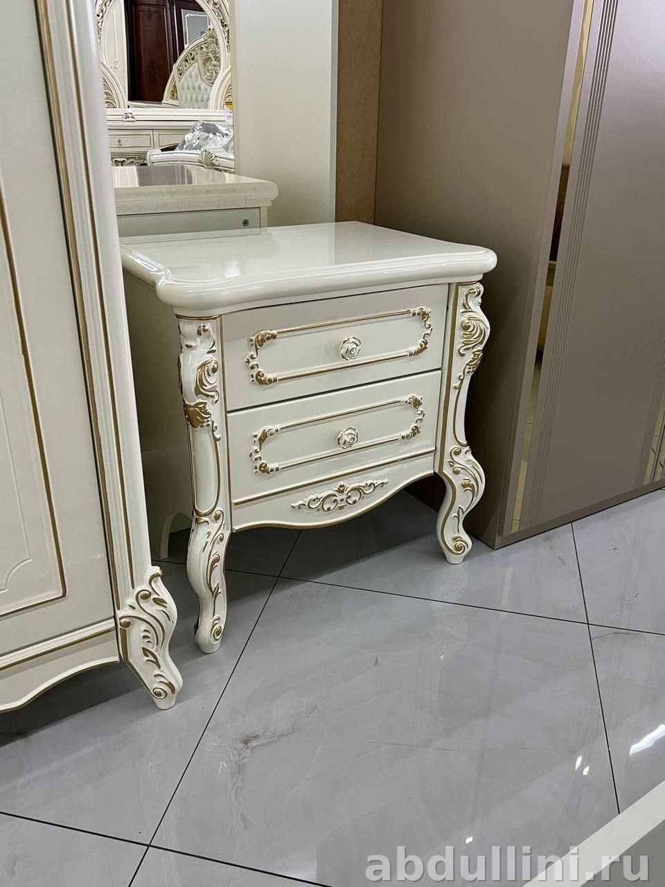 - Прикроватная тумба с двумя выдвижными ящиками и изогнутыми ножками. Размеры: 500*430*530 см.