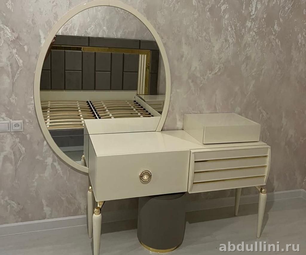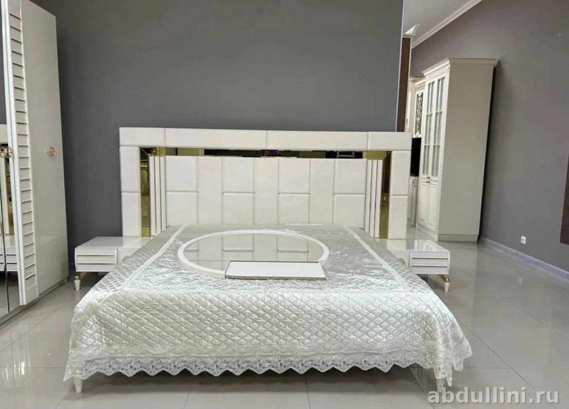 Комплект для спальни в современном стиле с элементами неоклассики. Основные цвета — кремовый и золотой, отделка — глянцевая поверхность с золотистыми вставками. Мебель выглядит дорого, но без лишнего пафоса.