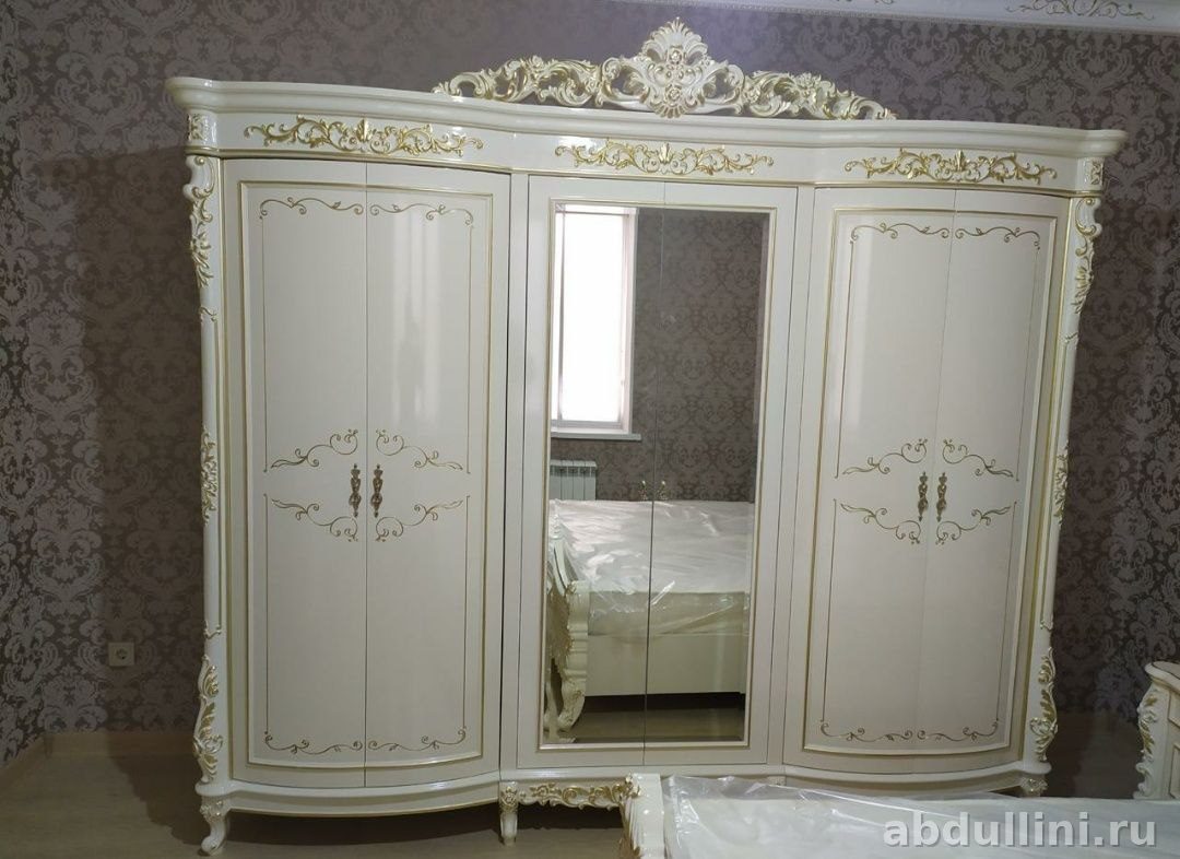 Комплект для спальни в стиле барокко из Беларуси. Светлая глянцевая поверхность цвета слоновой кости с золотой патиной, резные узоры и капитоне на изголовье — выглядит дорого, но без вычурности.