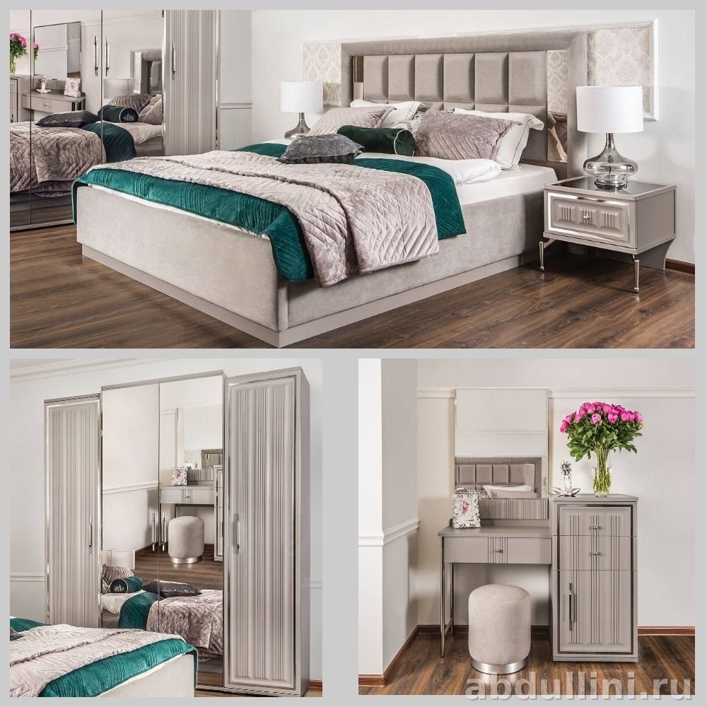 - Конструкция: кровать с высоким мягким изголовьем и сплошным основанием, шкаф-купе с вертикальными декоративными полосами, туалетный столик с зеркалом и пуфом, тумбочка с выдвижными ящиками и открытой нишей.