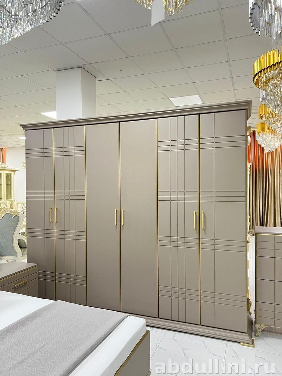 Комплект мебели для спальни в современном стиле с элементами декора. Включает кровать с высоким изголовьем, две прикроватные тумбочки и шестистворчатый шкаф. Цветовая гамма — приглушенный серо-бежевый оттенок (тауп) с матовой отделкой. Декоративные золотистые полосы и фурнитура добавляют изящества.