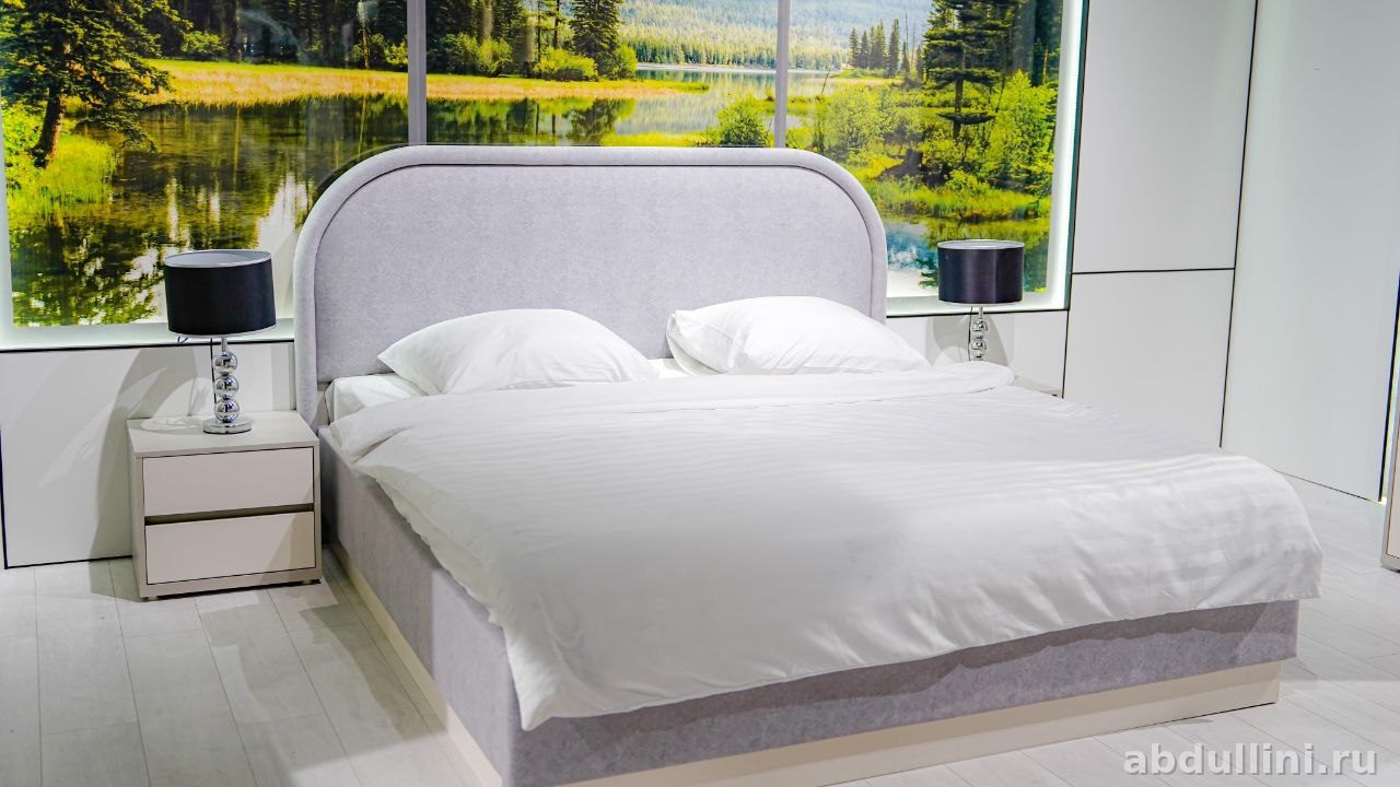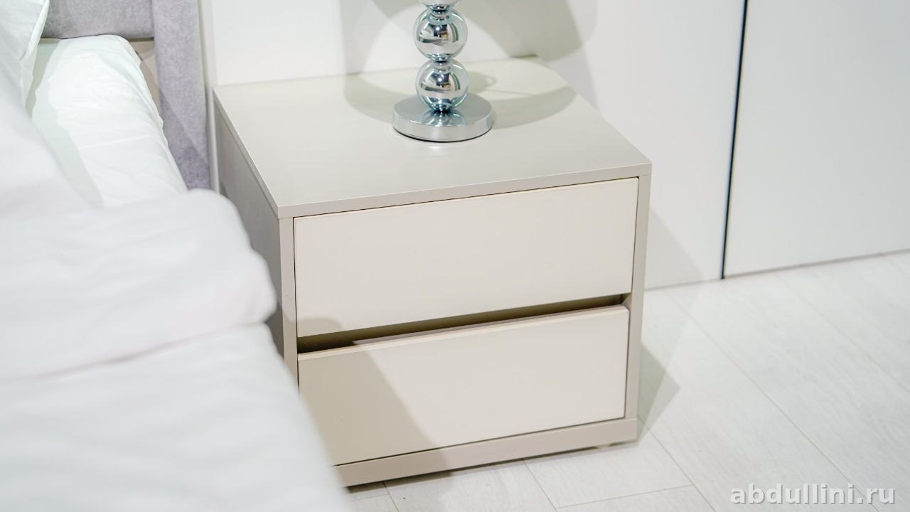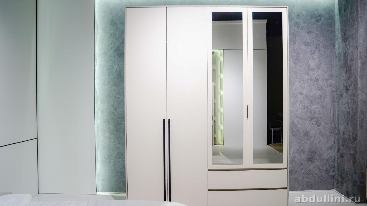 Комплект для спальни из Казахстана: шкаф, кровать, комод и тумба. модный дизайн, нейтральные цвета — светло-серый и белый с матовой поверхностью. Подойдет для тех, кто ценит минимализм и порядок.