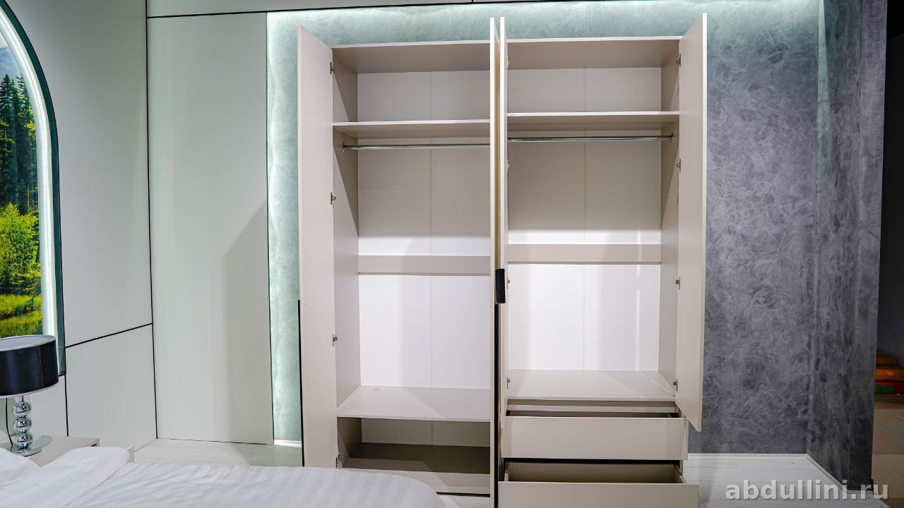 - Комод: 1392×1735×466 мм. Три выдвижных ящика — удобное хранение.