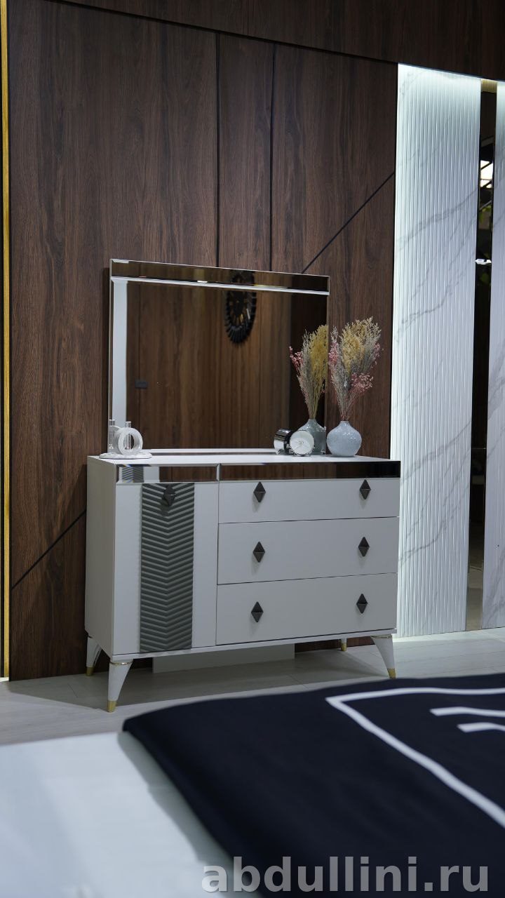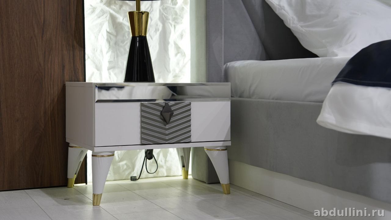 - Тумбочки: белые, глянцевые, с серыми геометрическими вставками. Один выдвижной ящик и открытая ниша. Ножки с золотистыми наконечниками.