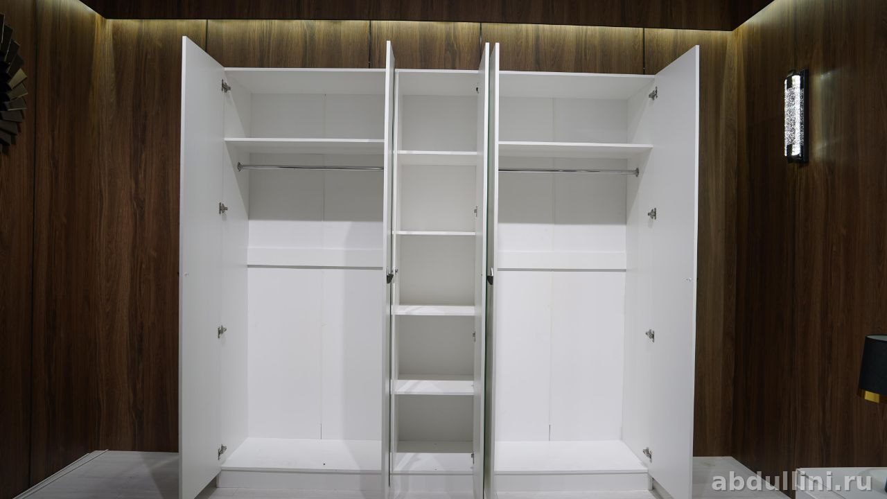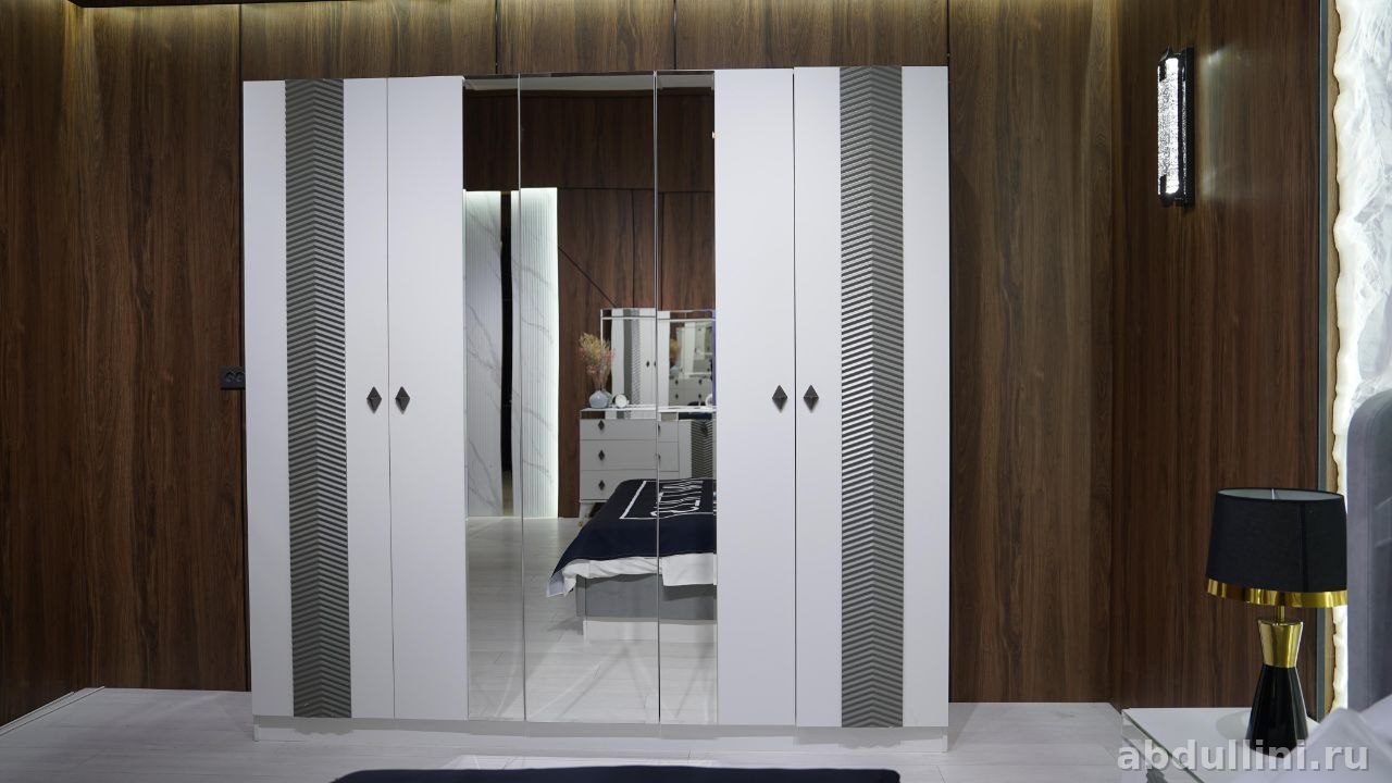 - Шкаф: шестидверный, белый глянцевый. Центральные дверцы — зеркальные, боковые — с вертикальными серыми узорами. Ручки черные, геометрические.