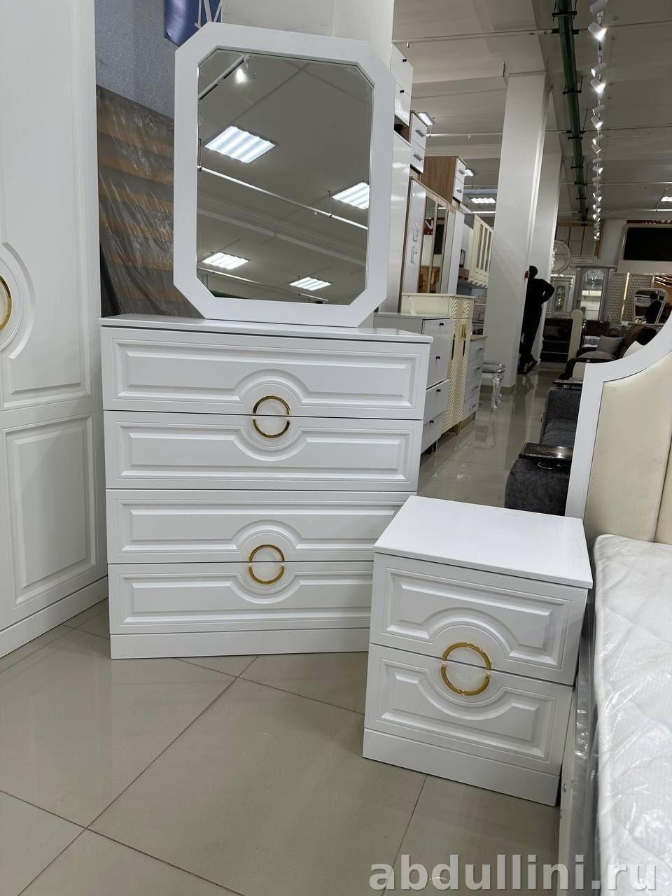 - Комод: три ящика, белый, золотистые ручки. Верхнее зеркало в восьмиугольной раме.