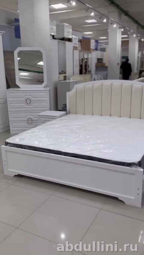 - Кровать: двуспальная с мягким изголовьем кремового цвета, вертикальной прострочкой. Каркас — белый ЛДСП/МДФ, реечное основание под матрас (матрас не входит в комплект).