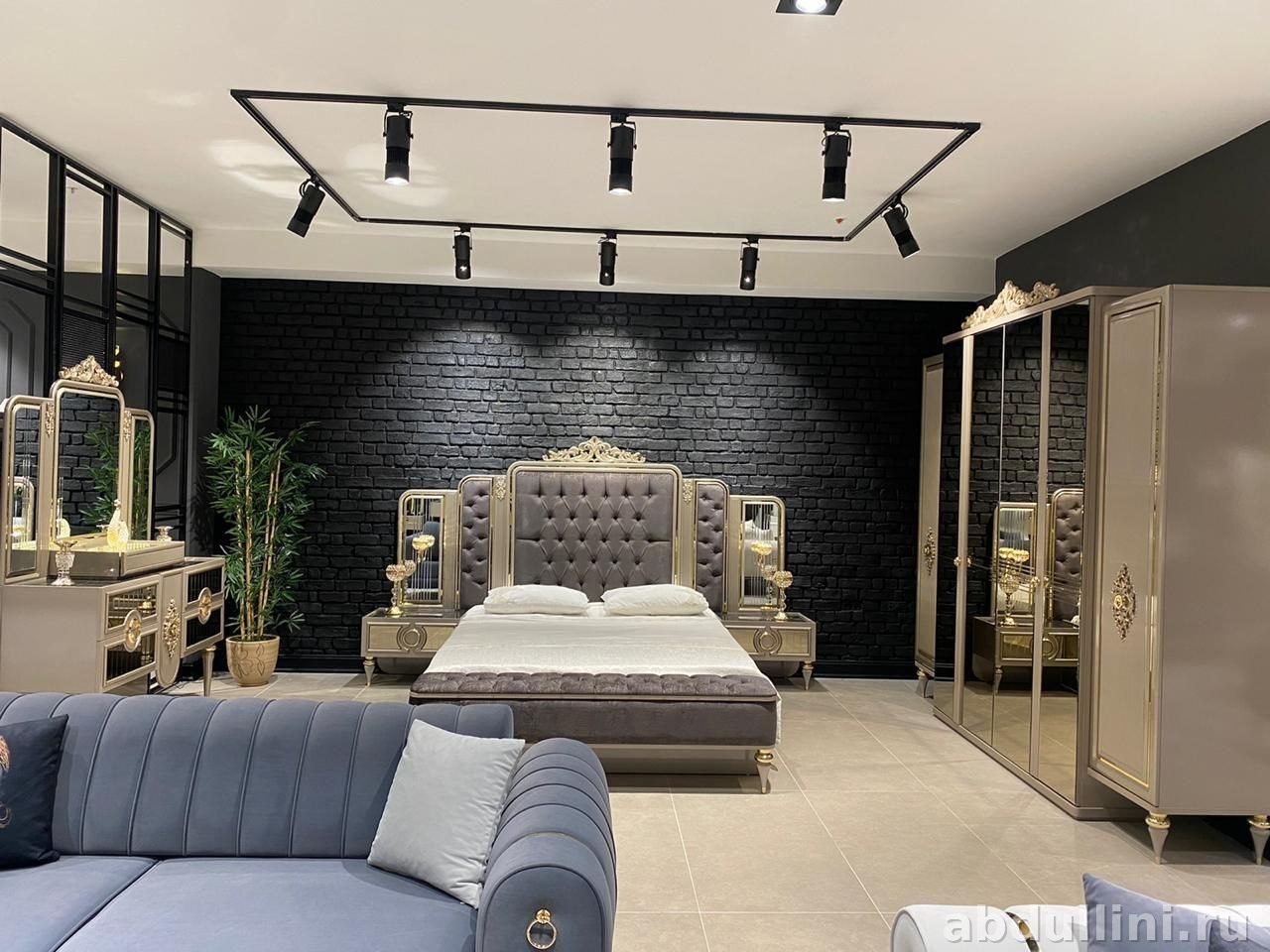 Гарнитур подойдет для просторной спальни. Золотистая фурнитура и зеркала добавляют интерьеру света. Доставка по Дагестану, возможен заказ индивидуальных размеров.