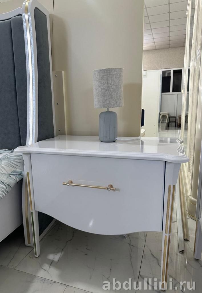 - Тумбочки: белые глянцевые, с серебристыми ручками.