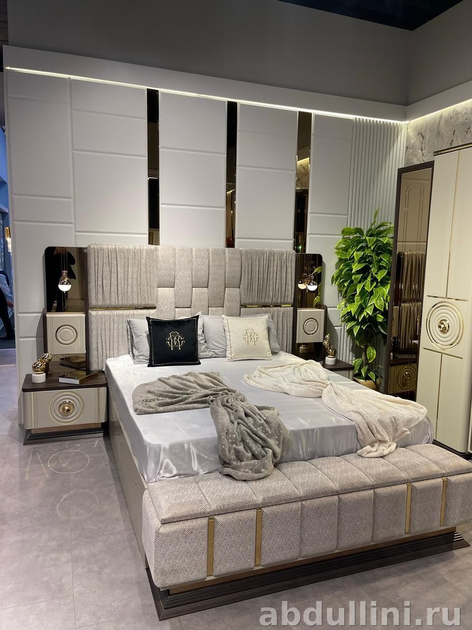 - Комплектация: кровать с мягким изголовьем, 2 прикроватные тумбы, комод с зеркалом, бельевой комод, напольное зеркало, банкетка, шкаф