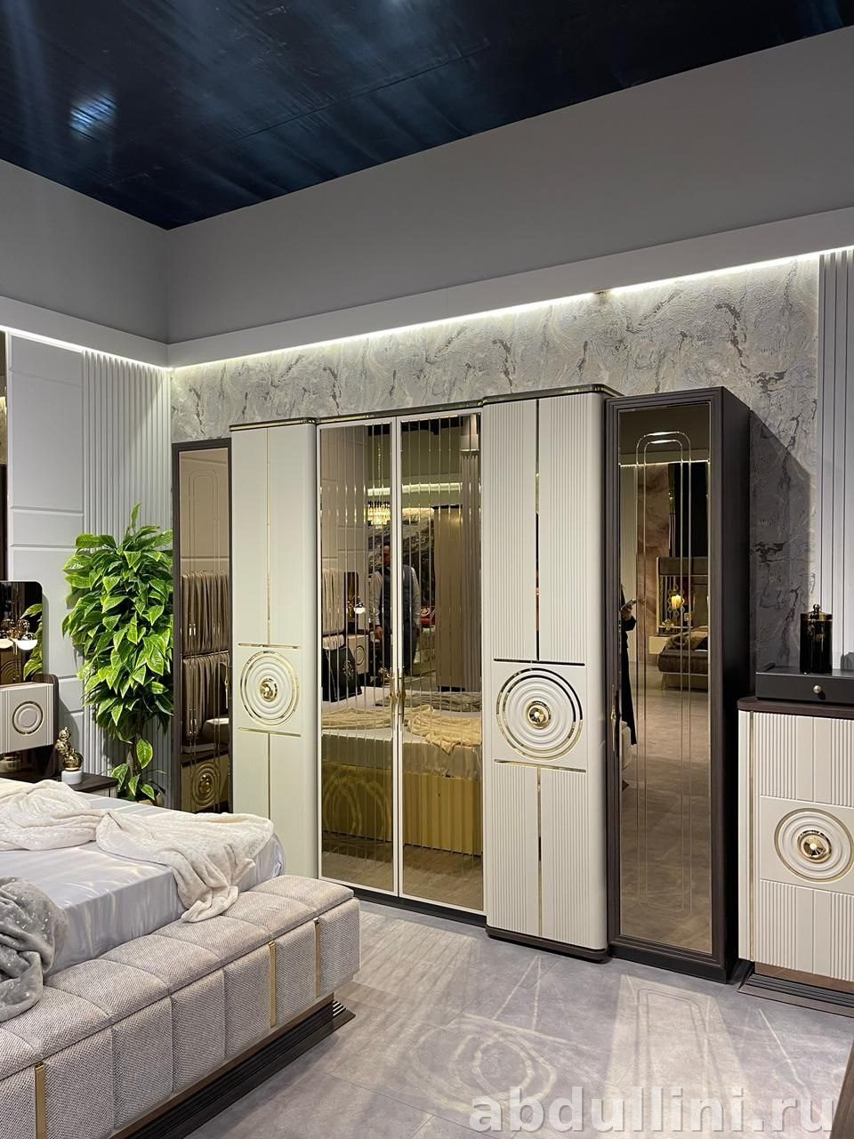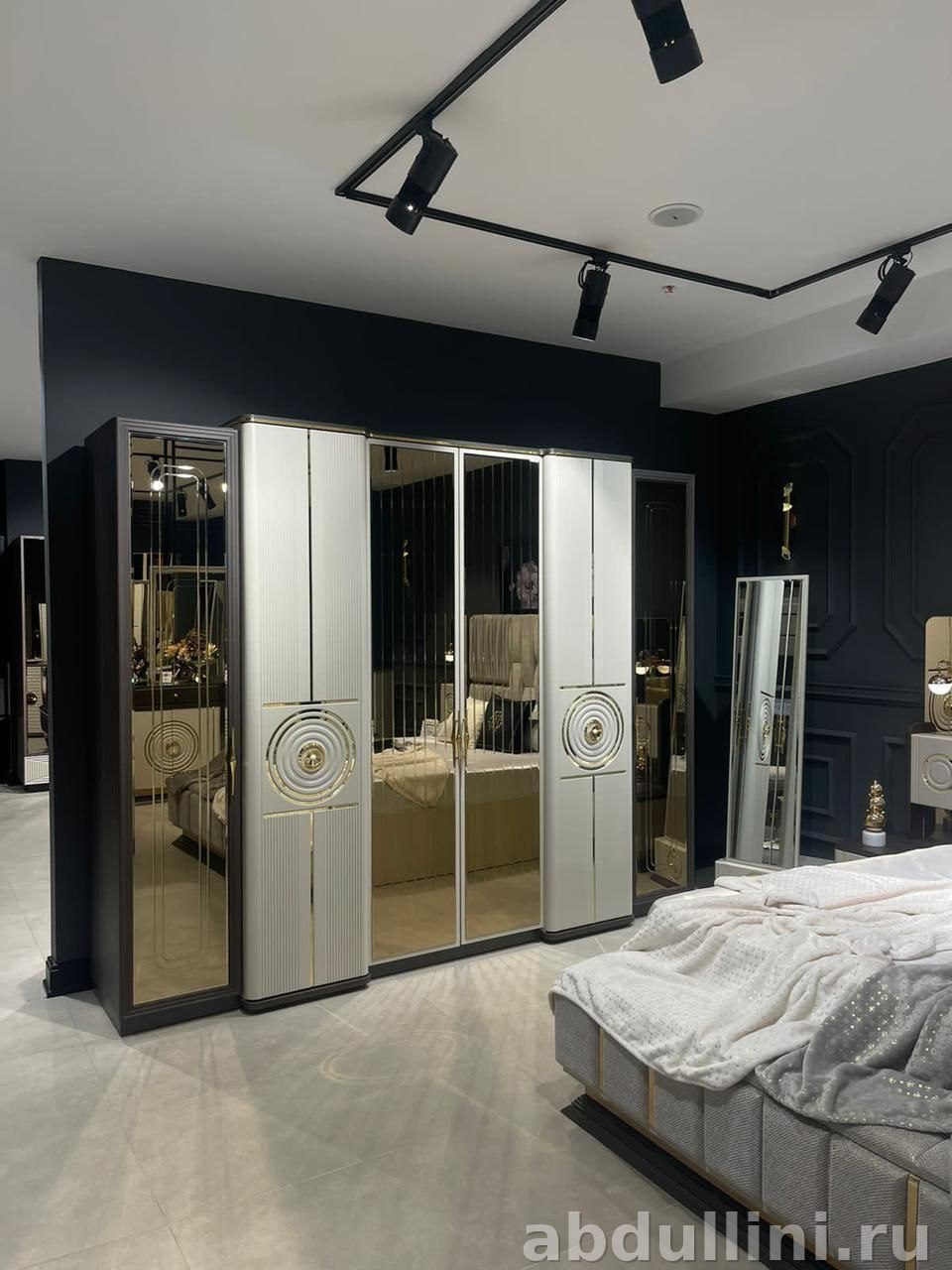 - Материалы: МДФ с ламинацией, зеркальные вставки, металлическая фурнитура с золотистым покрытием