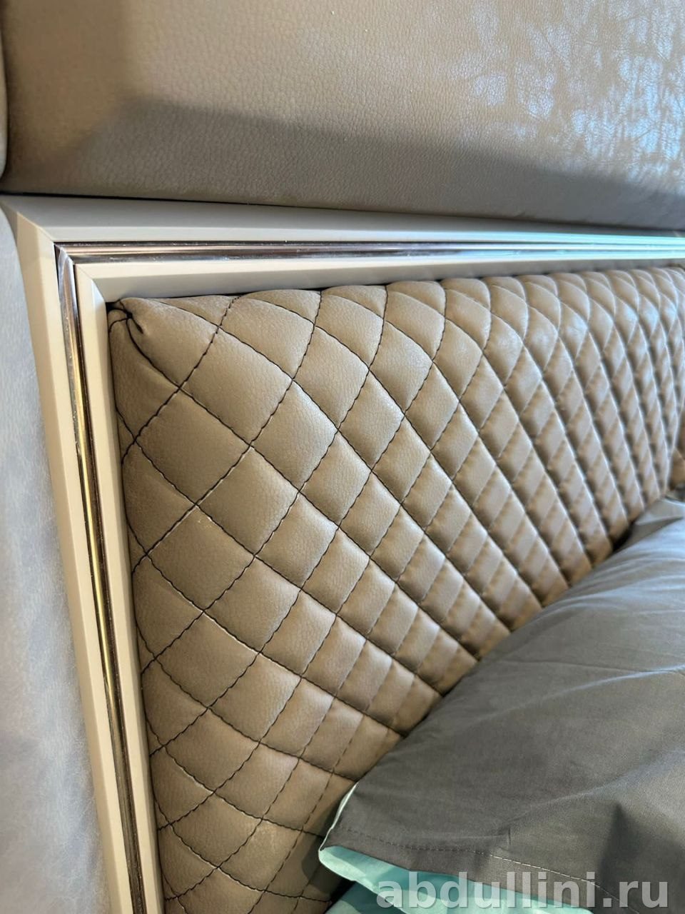Материалы: каркас кровати — металл с ламелями, изголовье — экокожа с ромбовидной стежкой. Шкаф и тумбы — ЛДСП с матовой отделкой в серо-бежевой гамме. Фасады шкафа частично зеркальные, с вертикальными полосами.