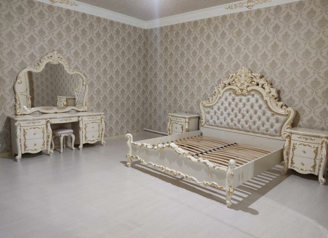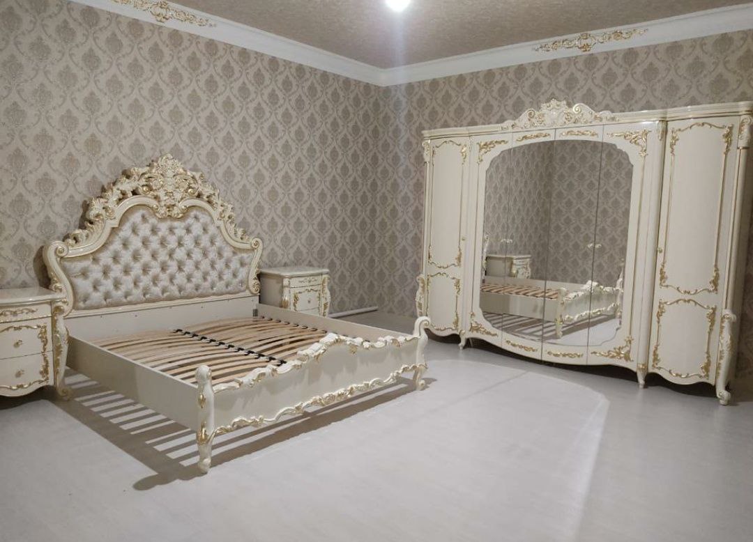 Гарнитур предназначен для обустройства спальни в классическом интерьере: в квартире, частном доме или гостевой комнате. Кровать рассчитана на матрас 180×200 см (подбирается отдельно). Комплект будет особенно удобен в помещениях, где важно объединить вместительное хранение (за счет шкафа 6Д) и функциональную зону ухода (туалетный столик с зеркалом) без потери единства дизайна. Пуф можно использовать как дополнительное сиденье у туалетного столика или как элемент, дополняющий композицию у кровати.