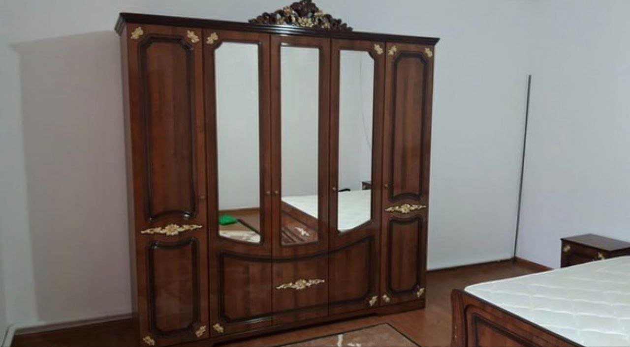 - Комплектация: Шкаф 4-х створчатый, кровать, 2 прикроватные тумбочки, комод, зеркало, матрас (180×200 см)