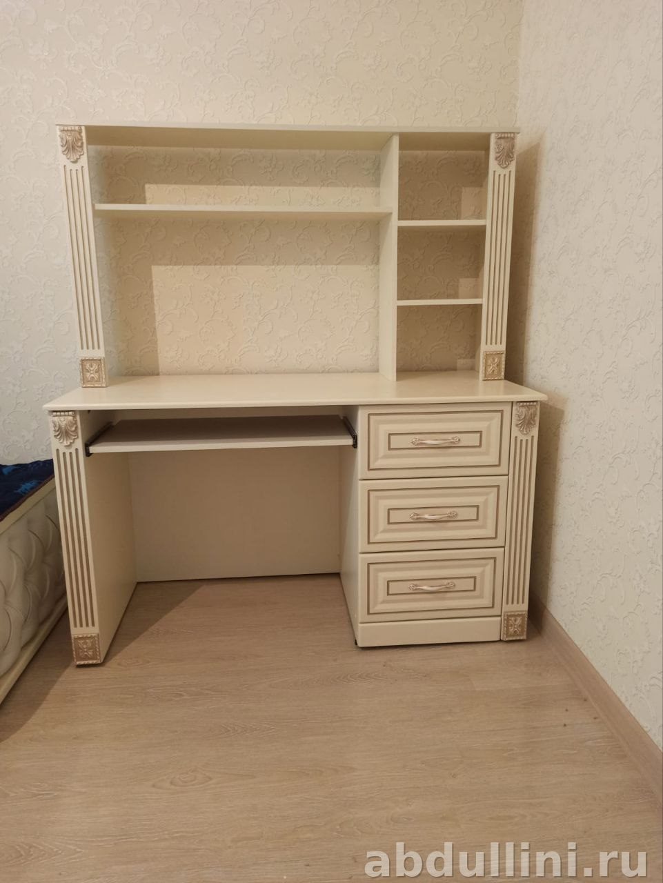 Комплект состоит из письменного стола и надстройки с полками. Стол выполнен в цвете ваниль, матовая поверхность. Декоративные элементы: узоры на колоннах и дверце, золотистые контуры.