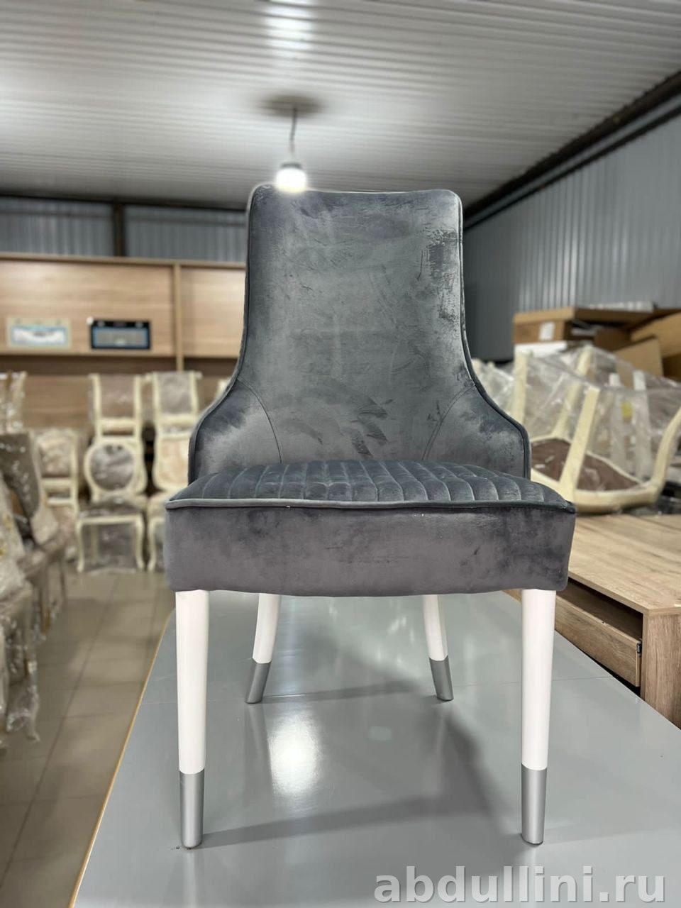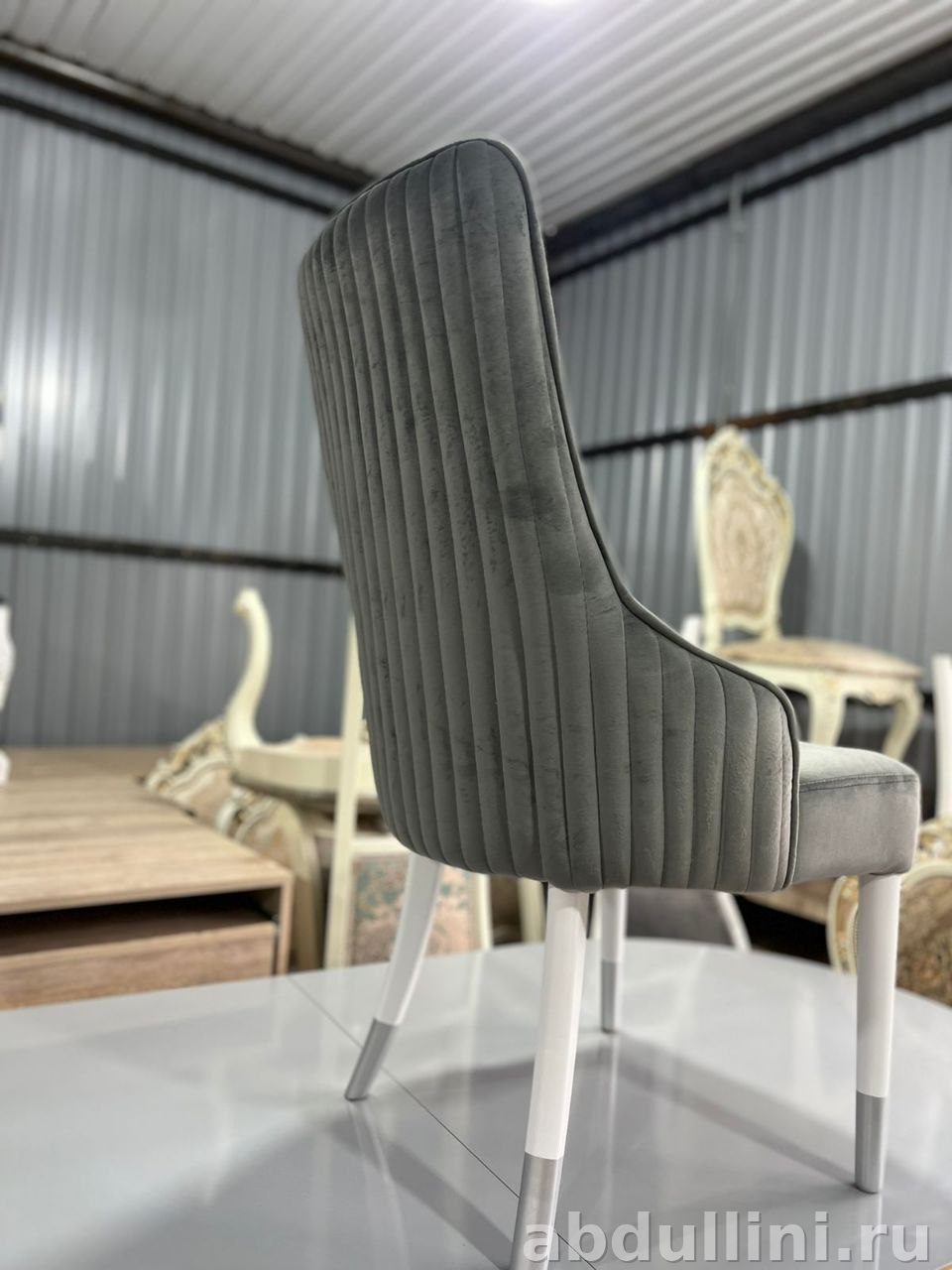 - Обивка: дымчато-серый велюр или бархат, матовая поверхность, ромбовидная прострочка на сиденье.