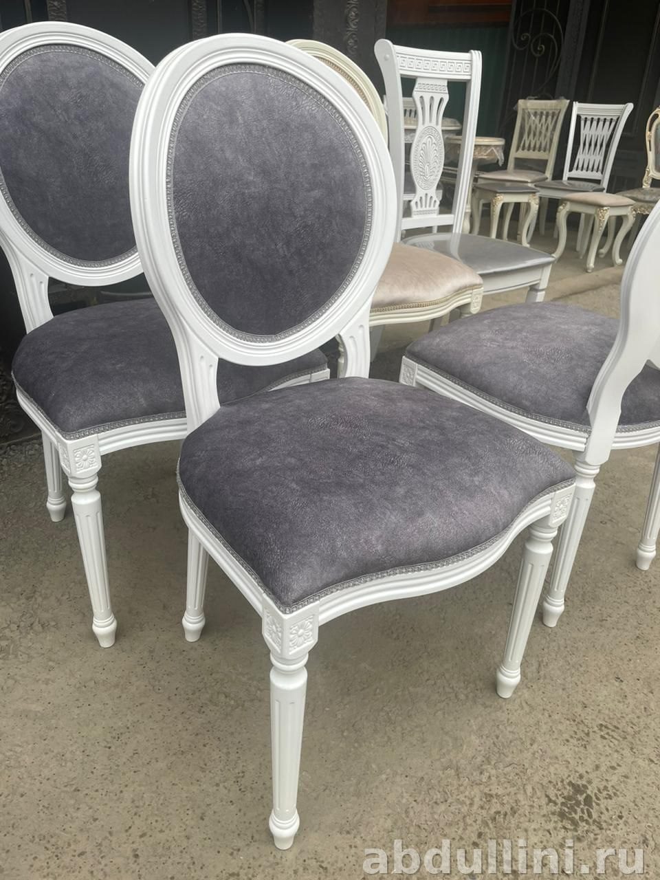 Стул с круглой спинкой и мягкой обивкой в стиле неоклассика. Каркас — белый с кремовым оттенком, матовый. Декоративные элементы: золотистый кант по краю сиденья и спинки, полосы на ножках. Обивка — ткань набук с текстурой под мрамор (светло-розовая) или гладкая темно-серая (графит).