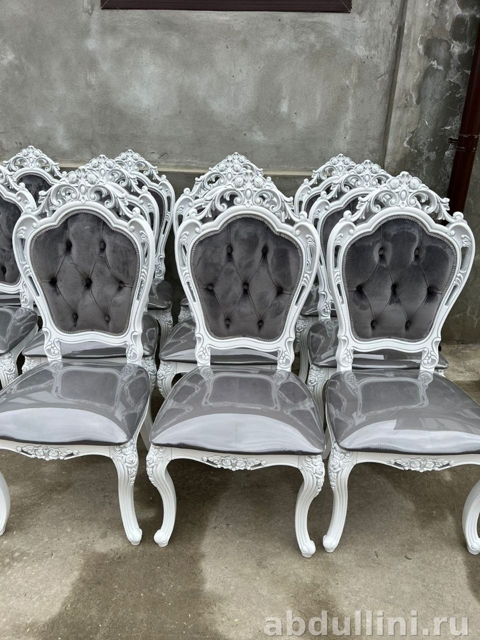 Комплектация: один стул. Каркас — массив дерева или МДФ с глянцевой отделкой под слоновую кость (белый с кремовым оттенком) или чистый белый. Обивка — ткань: голубой дамаск с золотистым узором либо серый матовый велюр.