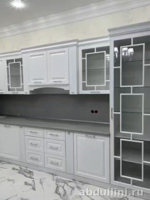 Фасады выполнены из крашеного МДФ в белом цвете с декоративной фрезеровкой. Корпус изготовлен из ЛДСП белого цвета. Столешница влагостойкая, серого цвета с текстурой белого мрамора. Петли оснащены доводчиками для плавного закрывания, а ручки выполнены в серебре или золоте — на ваш выбор.