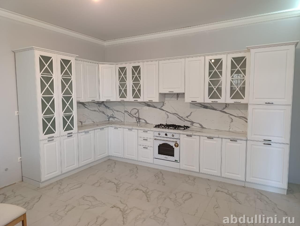 Кухня Лилу угловая — белая классика с мраморной столешницей