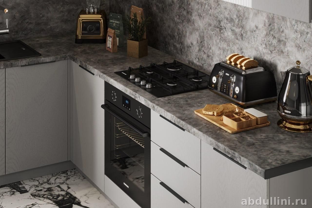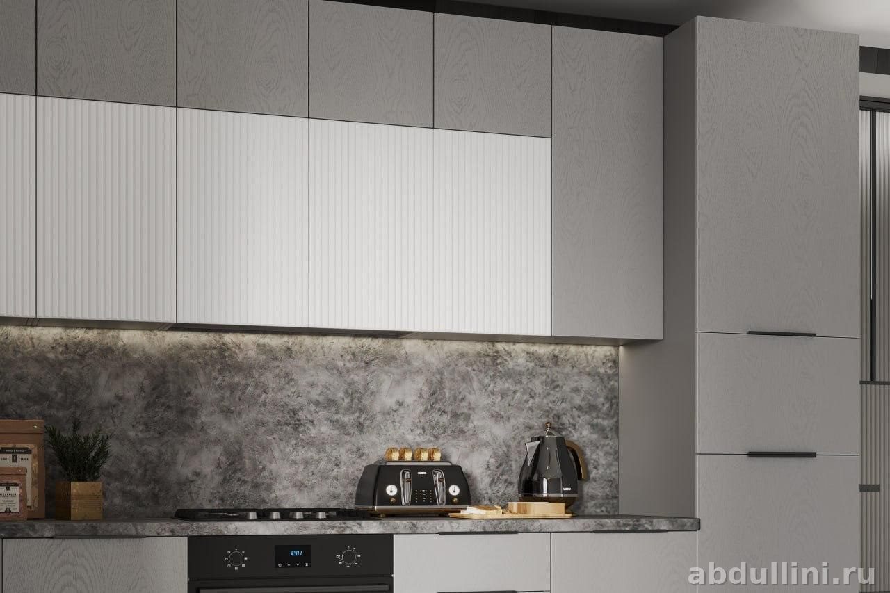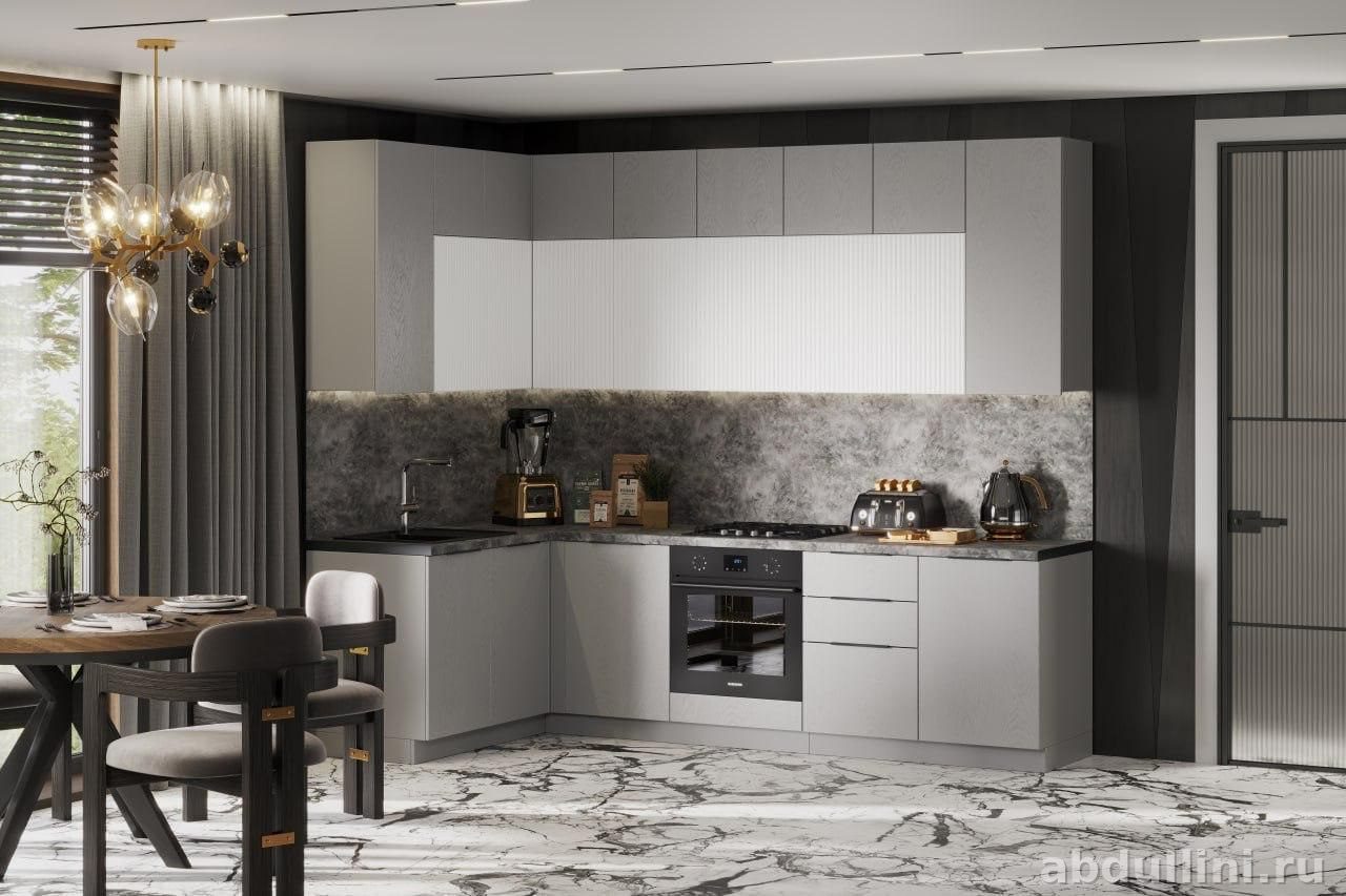 Угловой кухонный гарнитур в современном стиле. Фасады — матовый серый с текстурой дерева, часть верхних шкафов с белыми рифлеными фасадами. Столешница — темно-серая, имитация камня. В комплекте: нижние шкафы с распашными дверцами и выдвижными ящиками, верхние шкафы с полками, встроенная техника (духовой шкаф, варочная панель).