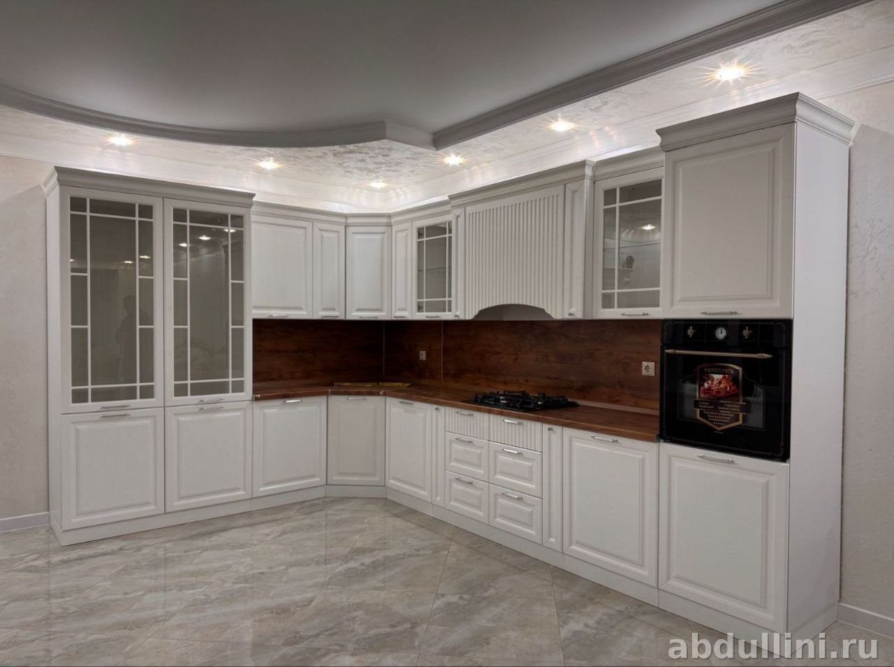 - Верхние шкафы: глухие фасады, стеклянные вставки с декоративной раскладкой, карниз.