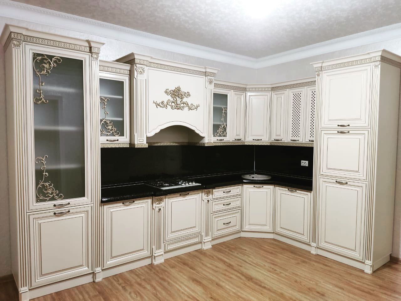 Элегантный угловой кухонный гарнитур «Венеция» в бежевом матовом цвете. Фасады из крашеного МДФ, фурнитура с доводчиками и стеновая панель в комплекте делают его превосходным решением для современной кухни.