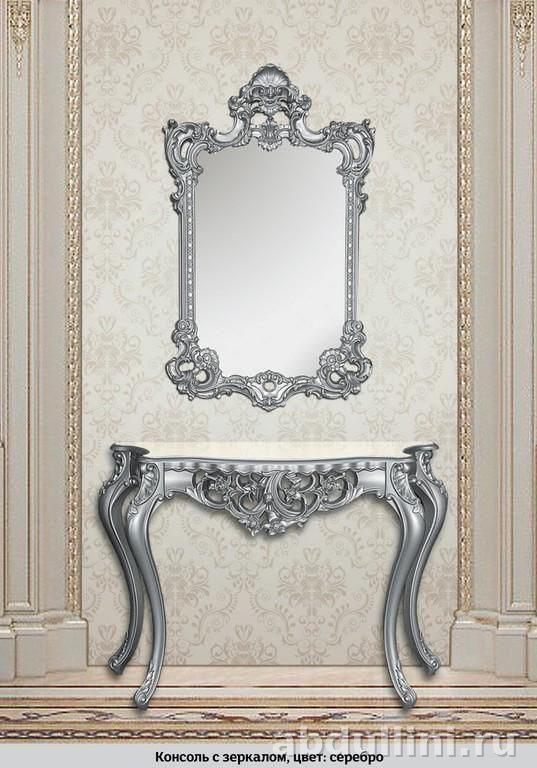 Комплект для прихожей или гостиной: столик с изогнутыми ножками и зеркало в резной раме. Цвет — серебристый или золотистый (глянцевый блеск). Материал — МДФ с покрытием под металл, столешница имитирует мрамор.